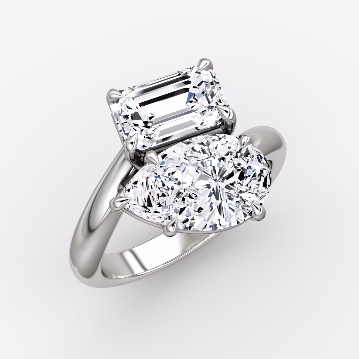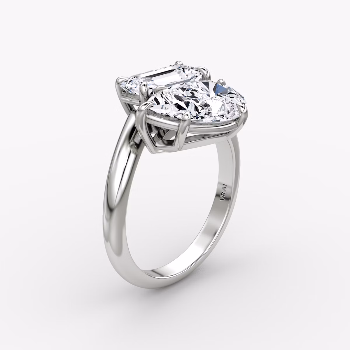 French for "you and me", the Toi et Moi Bypass celebrates your unique pairing. The two-stone design features a combination of overlapping Round Brilliant, Oval, Emerald, and Pear-shaped VRAI created diamonds highlighted on either end of a platinum or solid gold bypass ring.