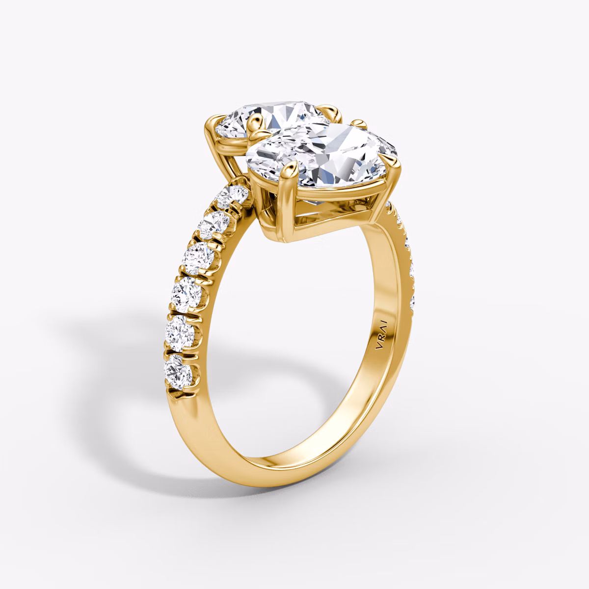 French for "you and me", the Toi et Moi Bypass celebrates your unique pairing. The two-stone design features a combination of overlapping Round Brilliant, Oval, Emerald, and Pear-shaped VRAI created diamonds highlighted on either end of a platinum or solid gold bypass ring.